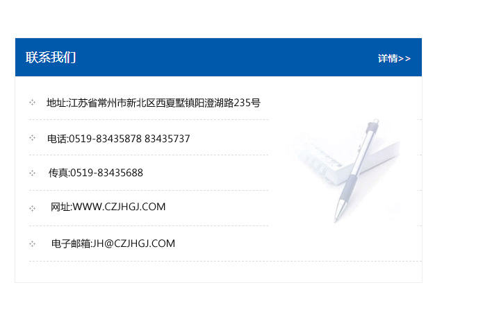 地址:常州市新北區友邦商務大廈1幢16、17層  電話:0519-85101652  傳真:0519-85112595  郵編:213022  網址:www.cz-jiayue_cn.pixiuwu.com  郵箱:xiajifengaa@163.com